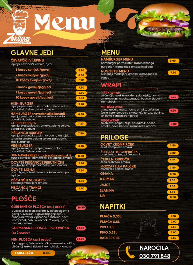 Dobrodošli v Zokijevo špajzo, vašo destinacijo za vrhunski okus hitre hrane v srcu Slovenije! Pri nas se lahko prepustite raznolikosti okusov in uživate v hitri, a kakovostni prehrani. Naša ponudba zajema priljubljene jedi, kot so čevapi, wrapi, hamburgerji in še več. Ne glede na to, ali iščete hitro malico ali popoln obrok na poti, smo tu, da vas razvajamo s svežimi in okusnimi jedmi. Obiščite nas in doživite okuse, ki vam bodo ostali v spominu!